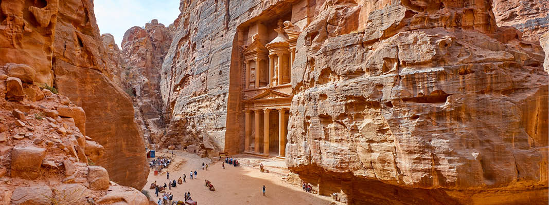 Vi starter med at gå de ca. 1,5 km gennem den snævre bjergkløft. På vejen ind betages man af farvespektret, og gamle relieffer udhugget direkte i klippevæggen viser, at vi er på rette vej. Pludselig sker det! Kløften åbner sig, og forude kan vi se den første søjle. For hvert skridt vi tager, åbenbarer mere og mere af templet sig, og pludselig står det dér, foran os, i sin fulde pragt. Og en samlet højde på 39 meter.