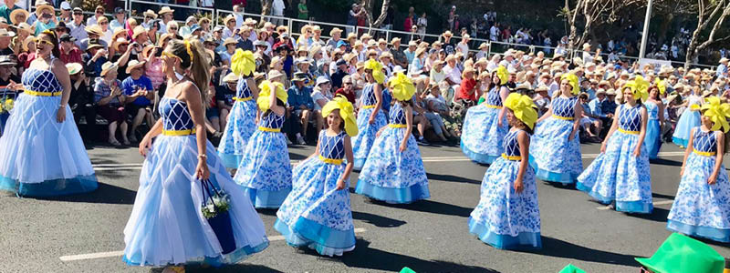 Om søndagen finder det festlige optog sted, hvor lokale grupper går gennem byen i en flot og farverig parade med fine blomsterkostumer og pyntede vogne. Sideløbende med de mange optog foregår en række andre aktiviteter, heriblandt koncerter, danseforestillinger og folklore optrædener.