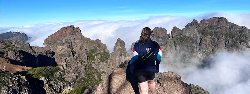 Det er vores sidste hele dag på Madeira – og vores sidste heldagsudflugt. I dag skal vi bevæge os fra højderne og ned til kysten, når vi tager fra Madeiras tredjehøjeste punkt, Pico do Arieiro, og hele vejen ned til Porto da Cruz via levadaen ved Ribeiro Frio og de velkendte trekantshuse i Santana. Dagen begynder med, at bussen kæmper sig op i hele 1818 meters højde. Der er sol til at begynde med, men jo højere op, vi kommer, jo tættere bliver skyerne. Men som ved et trylleslag har vi passeret skyerne og er nu på den anden side. Her skinner solen over de enestående udsigter, og vi forbløffes over de barske omgivelser, der ligner et månelandskab.