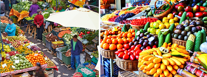 Markedet er opdelt i flere afdelinger. Frugt- og grøntafdelingen byder på en overflod af nyhøstede og friske lokale produkter alt efter sæson, bl.a. Madeira-bananer, ananasbanan Monstera, annona, cherimoja, mango, papaya, citrusfrugter, flere varianter af passionsfrugter og kiwi samt overdådige grønsager som søde kartofler, avocado. Fiskemarkedet lokker med frisk fangst fra Atlanterhavet, blandt andet tun og kårdefisk (espada), mens afdelingen med blomster bugner af farverige blomster og eksotiske planter. Frister noget over evne, må du gerne hjemtage planteknolde, så du kan prøve at gøre Madeira kunsten efter hjemme i haven.