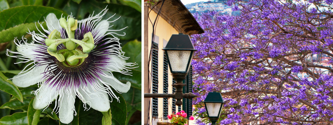 Billeder: Passionsblomst og jacaranda-prydtræet i fuldt flor.