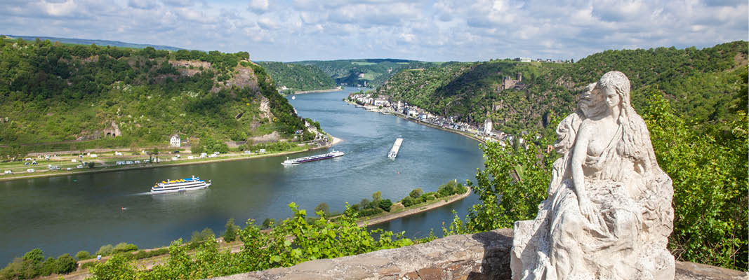 Efter frokost ombord sejlede skibet videre ad Rhinen, og midt på eftermiddagen gled vi forbi Lorelei-klippen. Her genkaldte vi os sagnet om den unge kvinde, der pga. ulykkelig kærlig kaster sig ud fra klippen, hvorefter hun som sirene lokker sømænd med sin besnærende sang, så de lider skibbrud.