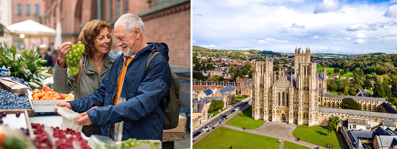 Foretrækker du i stedet at udforske omgivelserne uden for Bath, kan du tage med på den ekstra udflugt til byerne Wells og Glastonbury. Wells er en hyggelig markedsby, der hver onsdag afholder markedsdag. Her kommer handlende fra nær og fjern – en festlig affære, hvor du kan indsnuse stemningen og købe lokale varer. Vi besøger og Bishops Palace and Gardens og opleve det smukke haveanlæg (entré inkluderet).
