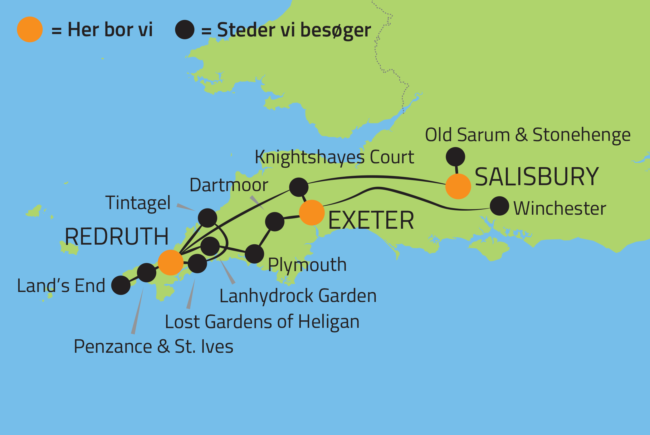 I Devon oplever vi den storslåede Dartmoor National Park, kendt for sine øde heder og vilde ponyer, samt de historiske byer Plymouth og Exeter. Cornwalls fortryllende kystlinje med charmerende fiskerbyer og den kreative kunstnerby St. Ives inspirerer med sine gallerier og kulturelle tilbud.