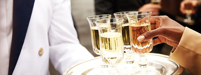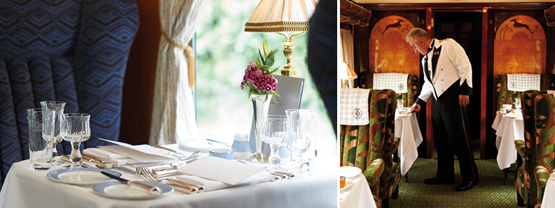 Vi kan glæde os til en udsøgt menu sammensat af flere lækre retter – både brunch og aftensmad – alle baseret på sæsonens friske råvarer og lokale specialiteter. Vi nyder maden i elegant dækkede vogne med hvide duge, krystalglas og sølvtøj, og udvalget af vine og drikkevarer er håndplukket og perfekt afstemt til måltidet.
