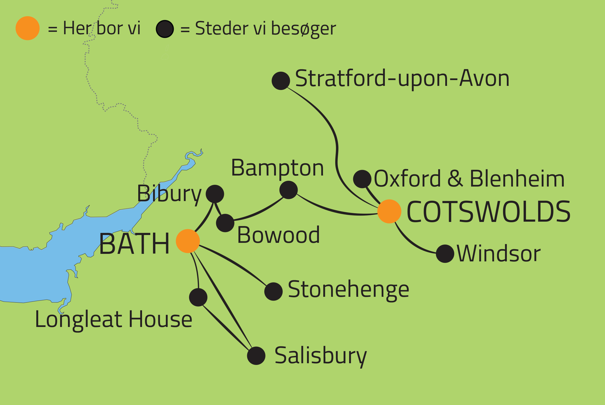 Mange englændere betegner Bath som en af landets smukkeste byer, og det står hurtigt klart hvorfor. Bybilledet er præget af klassicistisk, georgiansk og sengotisk arkitektur, og historiens vingesus mærkes overalt. Baths status som bevaringsværdig på UNESCOs Verdensarvsliste er fuldt berettiget, og vi besøger bl.a. de berømte romerske bade på Roman Bath Museum (entré inkluderet).