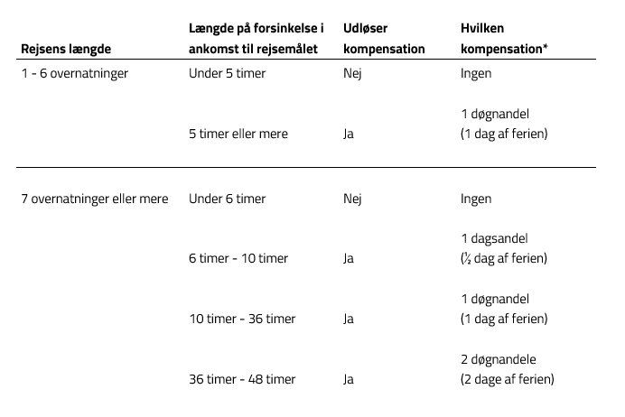 *Kompensation udregnes som følger: Rejsens pris fratrukket forsikringer og eventuelle tillægsydelser deles med antal overnatninger, afhængigt af om kompensationen lyder på en dags- eller døgnandel.