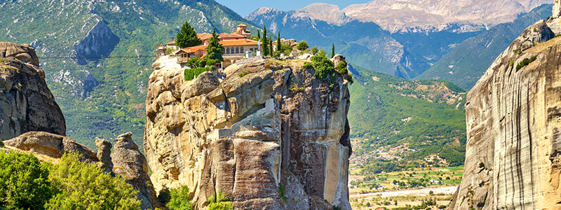 Herefter læner vi os tilbage i vores behagelige bus og slår mave, mens rejsen fortsætter nordover. Vi kører et par timer gennem et smukt bjergrigt landskab for herefter at krydse den store slette i Centralgrækenland. Den udgør landets største og mest produktive landbrugsareal. Det flade land er en virkningsfuld kontrast til næste højdepunkt: Det magiske Metéora! Man bliver ganske åndeløs ved synet af kæmpemonolitterne, der rejser sig over os. Små og store klostre er placeret på toppene, og det ser ud som om, de svæver. Deraf navnet Metéora, der betyder svævende på himlen.