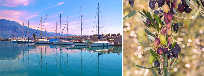 Billede: Havnen i Kalamata og Kalamataoliven.