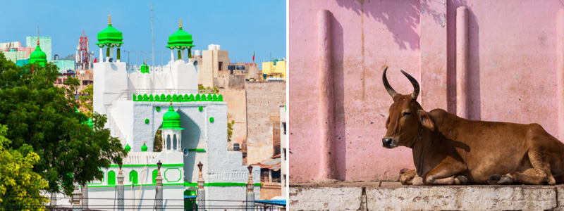 Billeder: Ajmer Sharif Dargah og hellig ko, der nyder tilværelsen.