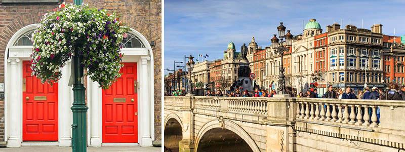 Billede: Farverige døre og O'Connel-broen i Dublin.