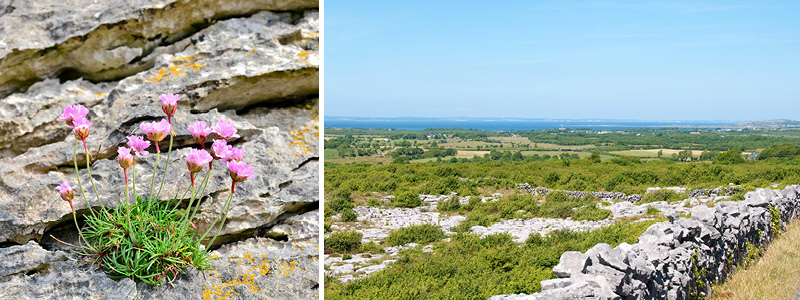 Vi kører via kalkstenssletten og nationalparken, the Burren, der blev dannet i forhistorisk tid for 300 mio. år siden og ser det helt unikke landskab. Få træer kan overleve på sletten, som til gengæld er fyldt med et blomsterhav, der især kommer til sin ret fra det tidlige forår til slutningen af sommeren. Hele tre-fjerdedele af Irlands blomster findes her. På vejen får vi flere fotostops som fx landsbyerne Ballyvaughan og Kinvara.