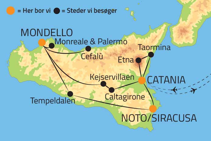 Hoteller: Vores hoteller ved Catania-kysten, Palermo-Cefalú-kysten og ved Syracusa variere fra afgang til afgang og der tages forbehold for ændringer indenfor kategori. Rejserne kan også kører i omvendt rækkefølge og dermed kan der rykkes på nogle af de inkluderede måltider. Alle elementer vil dog indgå.