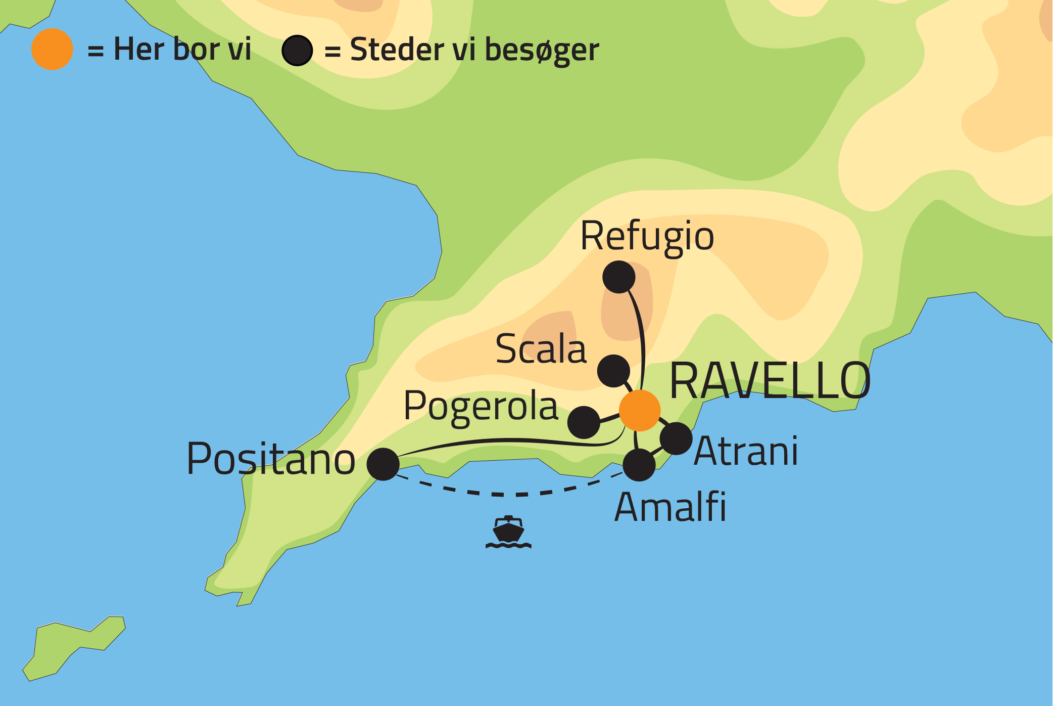 Her kan vi få fyldt vandflaskerne, og efter en kort pause fortsætter vi endnu en times tid ad asfaltvejen til nabolandsbyen, Montepertuso, hvor vi skal spise frokost. Efter en god og velfortjent pause fortsætter vi turen ned mod Positano, og efter godt en times vandring er vi fremme i den henrivende by med de mange pastelfarvede huse. Vi tager båden hjem til Amalfi, og undervejs kan vi så sidde og gætte på, hvor helt præcist det var, vi vandrede på tværs over alle bjergene. Vi når Amalfi efter ca. en halv times sejlads og kan så tage stilling til, om der er kræfter til at fortsætte op ad bjerget til Ravello, eller om bussen vil være at foretrække.