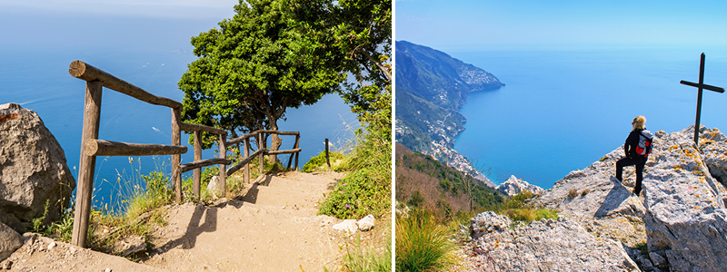 Vi går gennem kastanjeskoven, forbi små gårde, lokale vinmarker og Punta delle Castagne, der ligger 715 m over havet. Vi forlader skoven og går endnu højerere op. Amalfikysten og Middelhavet ligger langt under os, og turen byder på dramatiske klippefald mod havet, åbne bjergterræner og storslåede udsigter.