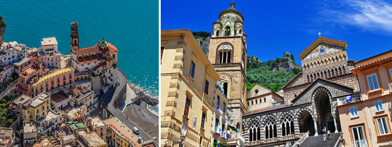 Vi går videre til Atrani, én af de fineste små byer på hele Amalfikysten og Italiens mindste kommune med blot 950 indbyggere. Den er udnævnt til en af de smukkeste landsbyer i Italien ”I Borghi piu belli d’Italia”, hvilket er en virkelig hæder, da titlen ikke kan søges. Atrani er stort set ukendt af de mange turister, der ellers kommer på Amalfikysten. Det skyldes at byen, som er nærmeste nabo til selve Amalfi, ligger under kystvejen, som passerer på en bro hen over husene, stranden og torvepladsen. Den lille centrale torveplads fungerer som byens dagligstue, og man føler næsten, at man er med i en film, når man træder ind på den lille plads. Byen har flere restauranter, og vi skal naturligvis også spise frokost i denne lille perle. Det gør vi hos de to brødre Roberto og Massimo på kystens bedste fiskerestaurant, som også har en anbefaling i den berømte Michelin-guide. Vi vandrer tilbage til Ravello sidst på eftermiddagen.