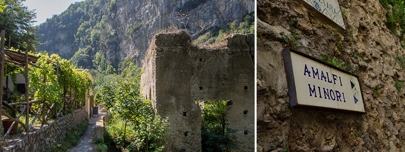 Fra Hotel Bonadies går vi til Pontone via Scala og Minuta og holder kaffepause på kirkepladsen og Bar Blu, hvor vi sikkert allerede har fået status af stamgæster. Vi lader op inden den smukke tur ind gennem Mølledalen "Valle dei Mulini" og ned til Amalfi. På vej gennem Pontone kan vi nyde de spændende kig ned mod Amalfi by og havet og beundre et lille miniature-dukkelandskab, som fortæller historien om livet på disse kanter. Vi fortsætter gennem de små marker og den fredede skov ind i selve Mølledalen. Vi holder pause ved ruinerne af den gamle akvædukt og kan her betragte den første af de tidligere vandmøller, der har givet dalen sit navn. Undervejs er der god mulighed for at møde en gedeflok med deres hyrde samt nogle af de mange arbejdsheste. Vi går helt ind i bunden af dalen, og hvis nogen er friske, er der mulighed for et hurtigt dyp i de mange badebassiner som er opstået i forbindelse med de små vandfald.