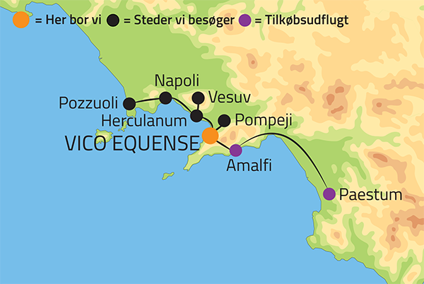 Efter ankomst kører vi til Vico Equense, hvor vi indkvarteres på det hyggelige familieejede Hotel Aequa. Vico Equense er en lille lokal by ved Sorrento-halvøens begyndelse, som ligger på et højt klippeplateau med udsigt ud over hele den hesteskoformede Napoli-golf. Fra hotellets terrasse er der en imponerende udsigt til vulkanen Vesuv.