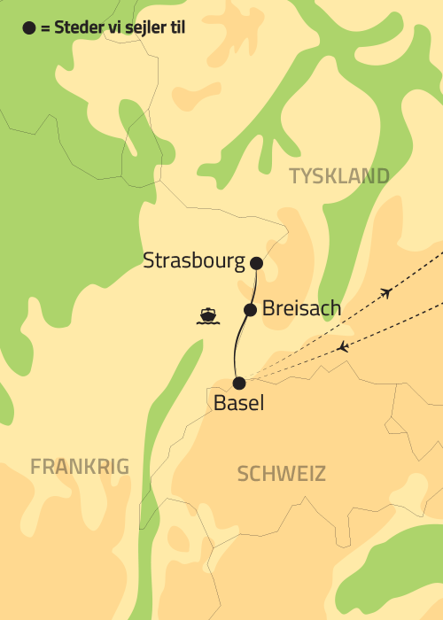 Velkommen ombord på vores flodkrydstogt, der agerer vores flydende hotel, fra hjertet af Alsace til de Schweiziske Alper. Glæd dig til 5 dage der bringer dig fra de charmerende gader i Strasbourg, til de farverige landsbyer; Colmar og Hansi. Et af rejsens store højdepunkter er, når vi med tandhjulsbanen kører i de schweiziske alper, gennem Eiger- og Mönch-bjergene til Europas højeste jernbanestation; Jungfrau-stationen.
