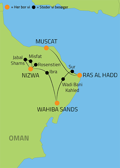 På denne rundrejse med dansk rejseleder, skal vi opleve Omans absolutte højdepunkter med ophold i hovedstaden Muscat, byen Nizwa med sine arkitektoniske vidundere og den prægtige Wahiba Sands ørken. Og så skal vi på hav og strand med delfin- og skildpaddeobservation. Helt unikt for Kulturrejser Europa besøger vi Omans prægtige bjerge, hvor der vil være spændende udflugter til bl.a. Omans Grand Canyon og samt til fine og unikke landsbyer. Vi besøger naturligvis også den smukke rosendal i "Green Mountains", hvor der produceres rosenvand, og den dragende duft af roser hænger forførende i luften.