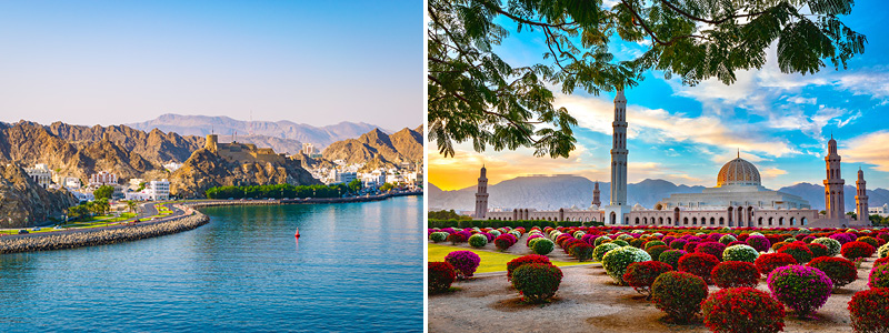 Hovedstaden Muscat er vores første møde med Oman. Byen ligger ud til vandet midt mellem ørkenen og bjergene.  Modsat andre af de kendte Golfstater, har Muscat bibeholdt den gamle og autentiske aura af beduinkultur. Med sine mange historiske seværdigheder og nye bygningsværker som giver en særlig elegance, kan Muscat ikke undgå at fortrylle sine besøgende.