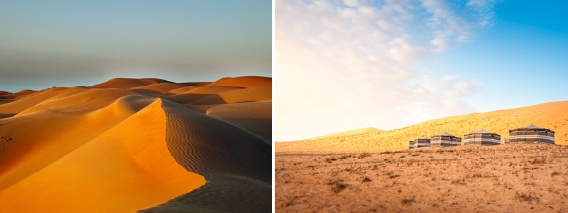 Ved ankomsten til Wahiba, skifter vi bussen ud med firhjulstrækkere, hvorefter vi kører ind i den rødgyldne sandørken. Det er både en sjov og fortryllende oplevelse at køre igennem, og opholde sig imellem, evigt foranderlige okkerrøde sandbjerge. Vi overnatter i en behagelig ørken-camp. Sæt dig på toppen af en sanddyne, og nyd solnedgangen og senere den fantastiske stjernehimmel. Nogle gange vil der være mulighed for at købe sig en "sejltur" på kamel eller blive hennatatoveret.