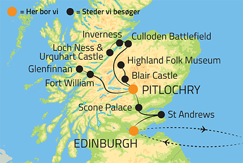 Formiddagen bruges på byvandring. Vi besøger bl.a. den historiske gamle bydel Old Town med Edinburgh Castle, som ligger på en bakketop for enden af The Royal Mile. Paladset har siden 1500-tallet huset mange skotske konger og dronninger, herunder Mary, Queen of Scots. I selve Old Town finder du snævre gader og tæt beliggende huse. I bydelen New Town er det klassiske georgianske bygninger fra 1700-tallet, der dominerer.