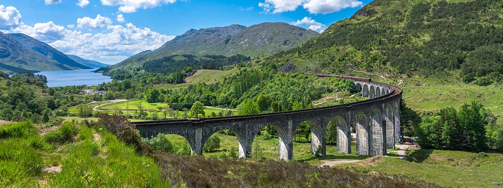 Efter vores besøg i Fort William tager vi på togtur gennem højlandet. Vi stiger ombord på ScotRails tog, som smyger sig igennem nogle af de smukkeste skotske landskaber fra Fort William til Glenfinnan. Her skal vi se den berømte Glenfinnan-viadukt, en imponerende jernbaneviadukt bygget mellem 1897 og 1901 af Robert ’Concrete Bob’ McAlpine. Viadukten har i alt 21 store buer, der hver spænder over 15 meter. Det er nemt at forstå, hvorfor viadukten er blevet en ikonisk attraktion – her er tale om stor ingeniørkunst, og fra udsigtspunktet kan du beundre synet af den storslåede viadukt omgivet af højlandet dramatiske landskaber. Er der noget bekendt ved synet, kan det måske skyldes, at du har set Harry Potter-filmene eller The Crown, hvor viadukten er med. Bemærk, vi kører med ordinært tog og ikke damptog på strækningen.