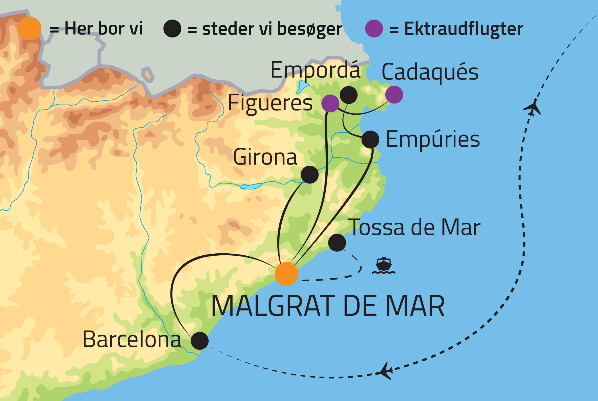 Costa Brava, der ligger i Cataloniens nordøstlige hjørne, strækker sig fra byen Blanes og helt op til den franske grænse. Navnet Costa Brava betyder vild kyst, og det er nemt at forstå hvorfor. Den spektakulære kystlinje er kendt for sine smukke forrevne klipper, skjulte bugter og krystalklare vand. I forlængelse af Costa Brava kan vi slappe af ved Costa Maresmes nærmest uendelige, gyldne sandstrande – årsagen til, at Costa Maresme har tiltrukket feriegæster fra hele Europa igennem mange år. Herudover er området det perfekte udgangspunkt, når man vil opleve både Barcelona by, der ligger blot en time mod syd, og det betagende og autentiske Catalonien ved Costa Brava.