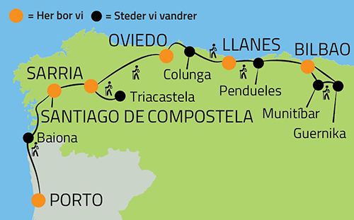 Caminoen er ikke én enkelt vej, men derimod et enormt netværk af ruter under stadig forandring. På Kulturrejser Europas vandretur på Caminoen tilbagelægger vi på en uge lidt over 80 km, som er fordelt på fire af de mest berømte pilgrimsruter i det nordlige Spanien og portugal. Undervejs forkæler Caminoen os med et foranderligt terræn og smukke naturmæssige variationer. Vandringen går fra bjerge og grønne dale til smukke kyststrækninger med farverige fiskerlejer og fra åbne vidder til dybe skove.