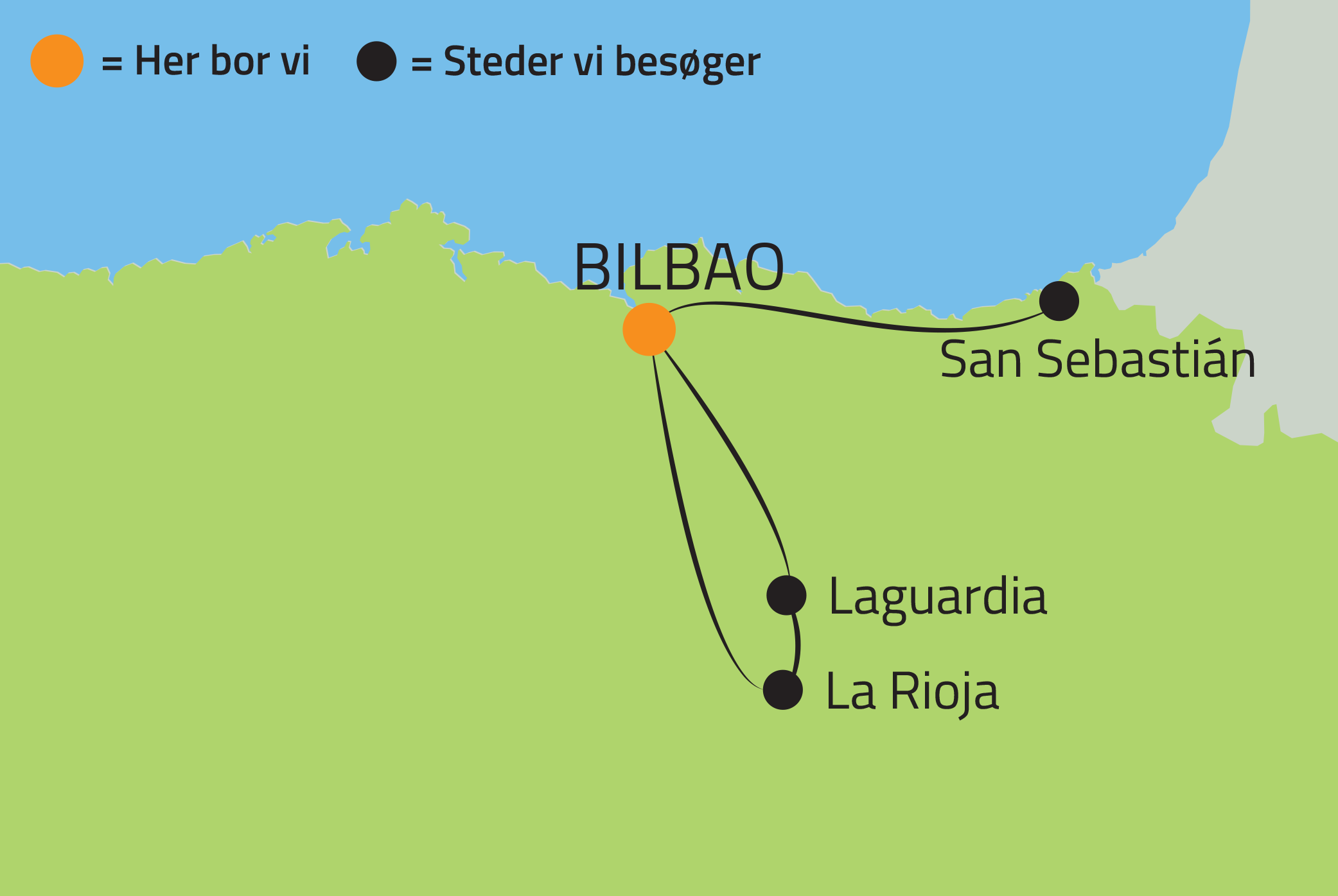 Baskerlandet er mest kendt for byerne Bilbao og San Sebastián, der begge balancerer gammelt og nyt til perfektion. Bilbao, der engang var industrielt centrum, er i dag genfødt af kunst og arkitektur og hjemsted for det ikoniske Guggenheim-museum, designet af Frank Gehry. San Sebastián er kendt for sin belle époque-charme og lokker bl.a. med skønne strande. Byen er netop berømt hos alverdens "foodies" og sin årlige filmfestival.
