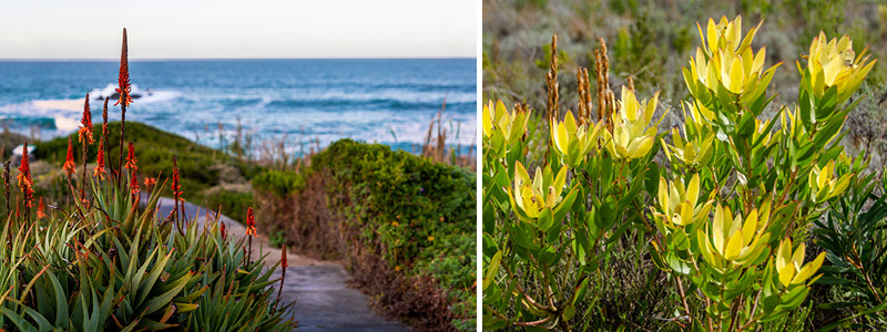 Billeder: Hermanus' kyst og et eksempel på fynbos.