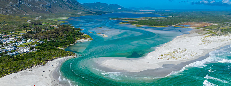 Herefter fortsætter vi til Walker Bay naturreservat, der strækker sig langs kysten øst for Hermanus. Her venter os storslåede landskaber med hvide sandstrande, klippeformationer af kalksten og udsigt til det åbne hav. Vi besøger også området Die Plaat, en fredelig strandstrækning, hvor naturen stadig er urørt og vild. Længere mod nordvest snor Klein River-lagunen sig gennem landskabet, og når vandstanden er høj, løber den ud i havet – et imponerende syn.
