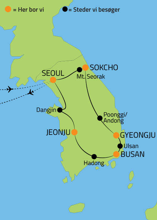 I Busan oplever vi markeder, FN-kirkegården, maleriske landsbyer og smukke kysttempler, mens vi i Hadong deltager i en teceremoni og nyder udsigten til floder og bjerge, inden vi når til Jeonju. Her slutter vi af med en nat i en traditionel, koreansk hanok og en smagsprøve på den traditionelle risvin, Makgeolli, inden vi rejser hjem fra Incheon Lufthavn.