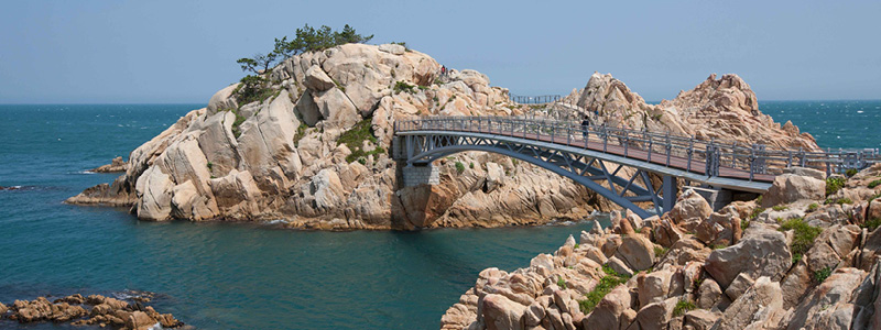 Næste stop er Daewangam parken, en smuk kyststrækning med naturskønne vandrestier gennem en farverig skov af fyrretræer, kirsebærblomster, magnolia, kamelia, abrikos og forsytia. Parken ligger ved det sydøstligste punkt ud mod Det Østkinesiske Hav, og fyrtårnet her er vigtigt for fiskere og øvrige søfolk. Vi ser også Daewangam klippen, der siges at ligne en drage, der stiger mod himlen. Den imponerende klippeformation er forbundet til fastlandet med en lille jernbro. Vi skal også opleve at gå på den 303 meter lange hængebro, som let svajende i vinden hænger over vandet. Fra broen har vi en uforlignelig udsigt over både kyst og hav.